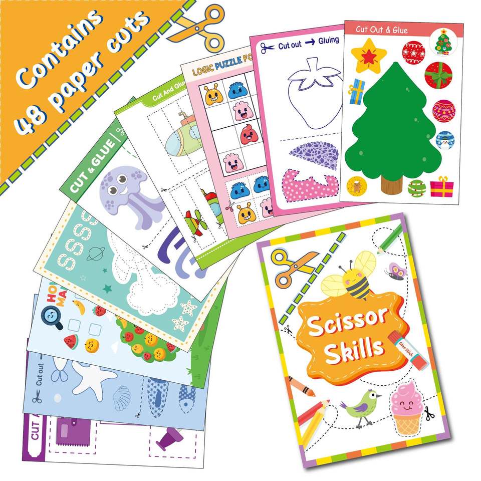 Libro di Attività per Bambini 48 Pagine con Forbici, Adesivi, Conteggio, Puzzle Illustrati, Quaderno di Ritagli e Incollaggi per Bambini