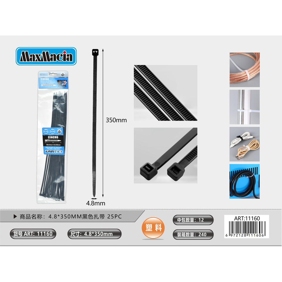 48x350MM Black Plastic Cable Ties 25 Pack Durable Fastening and Organization