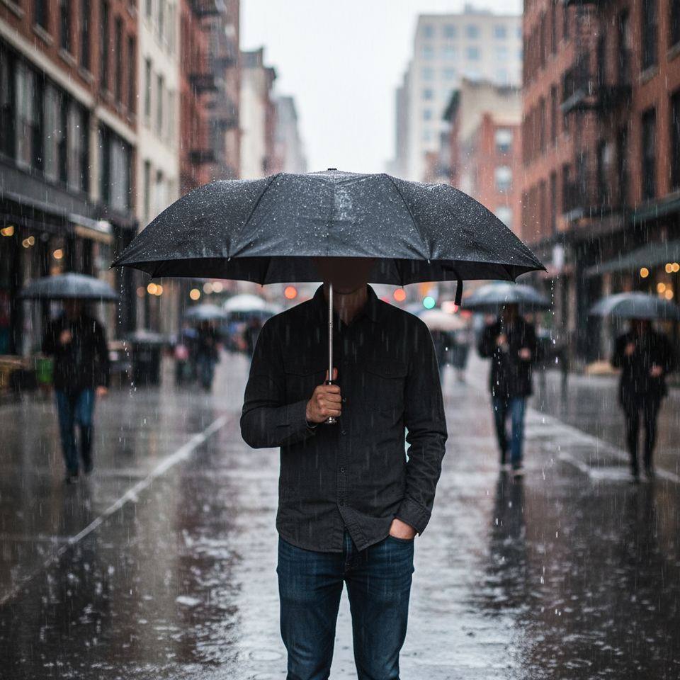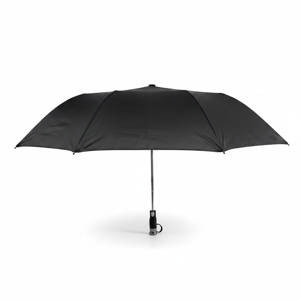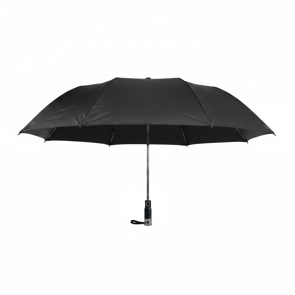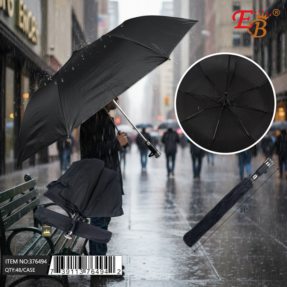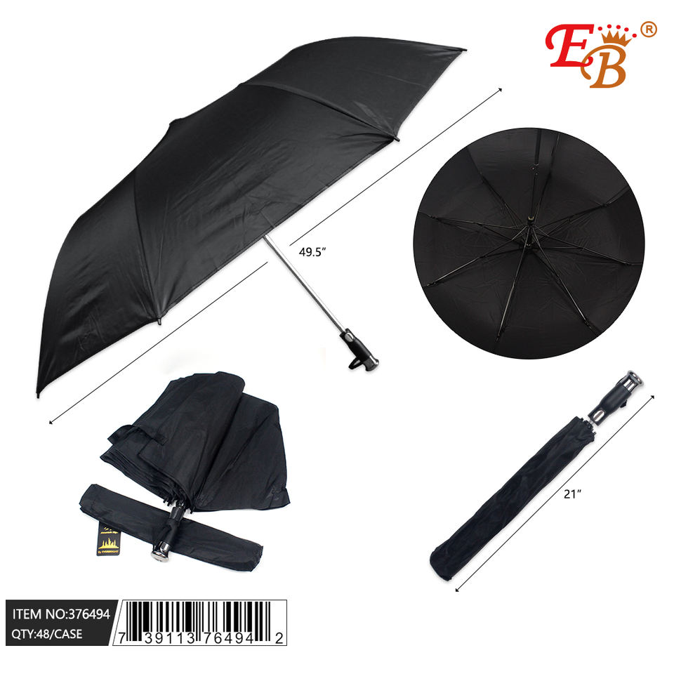 Ombrello tascabile smart nero da 49,5 pollici, 48 pezzi/cartone, materiale 190T, 8 stecche, controllo semiautomatico, pieghevole in tre parti