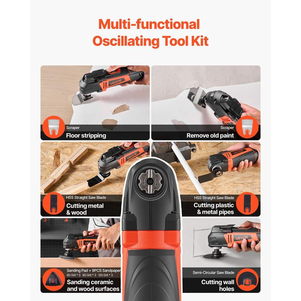 Utensile Multifunzione Oscillante Elettrico 4 Ampere, 6 Velocità Variabili, 7000-19000 OPM, Oscillazione 3.2 Gradi, con 6 Velocità Variabili