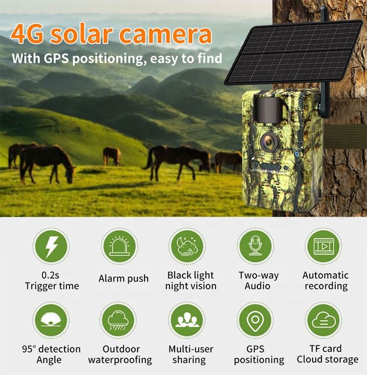 Night Vision, Vandal-Proof, Motion Detection, Waterproof / Weatherproof, Two-Way Audio, Low Power, 0.2s trigger time, GPS Positioning, black light night visionSpecial Features