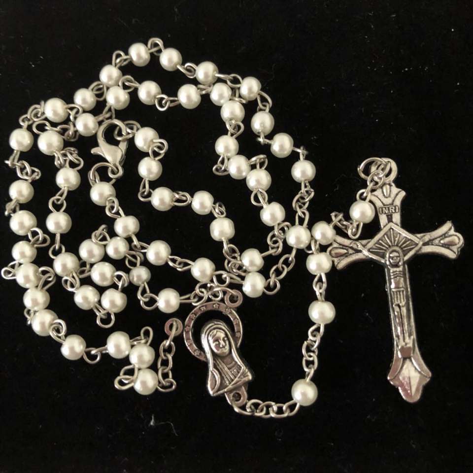 4mm Mini Glass Pearl Virgin Mary Rosary With Center in Pink, Blue and White Color and Lobster Buckle at the End