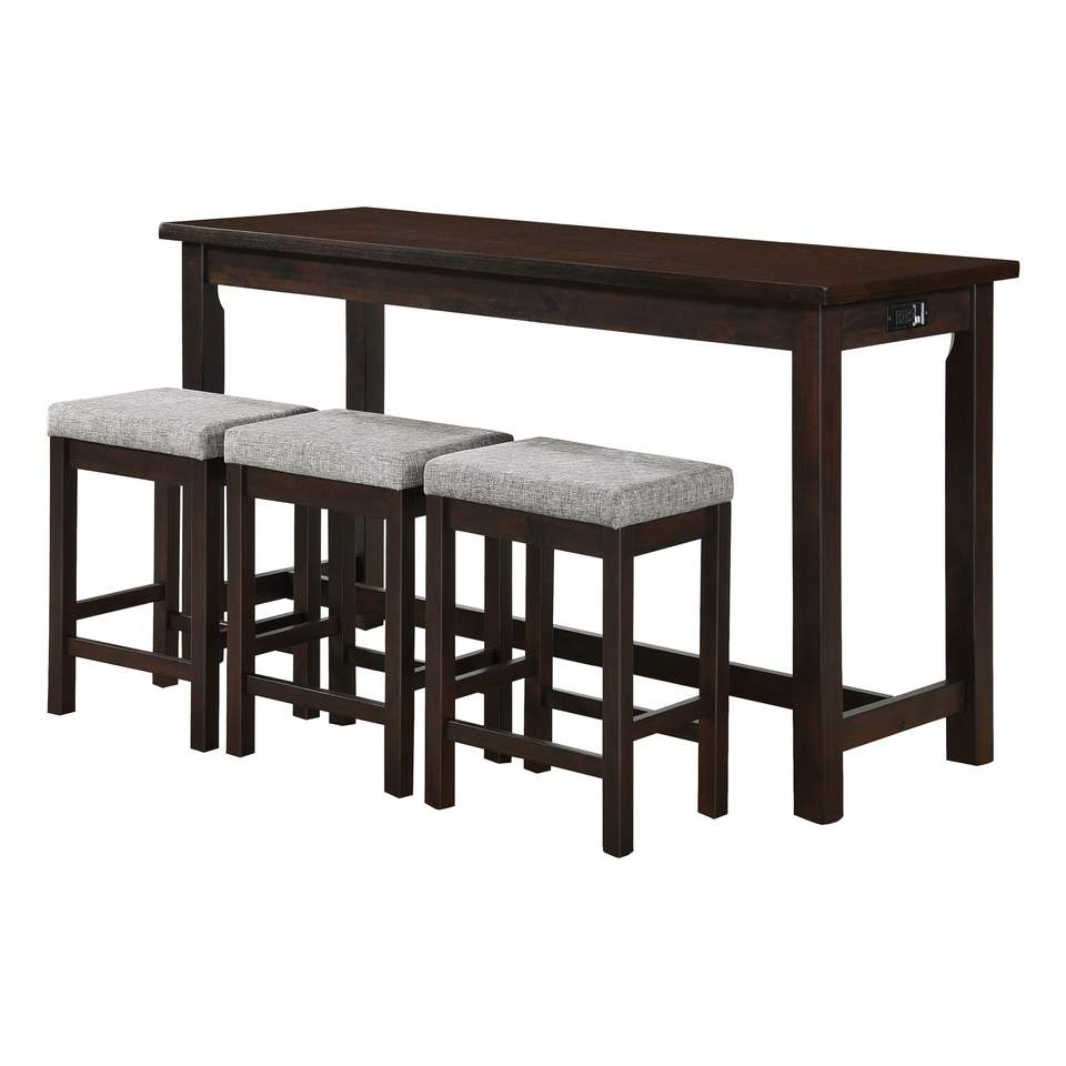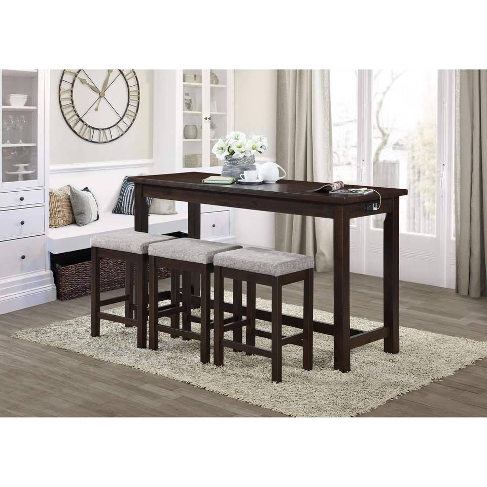 Set da Pranzo 4 Pezzi con Finitura Espresso, Altezza Bancone, Porte USB, Prese di Corrente, 3 Sgabelli Casual, Tavolo con Cassetto Integrato, Funzionalità Pratiche