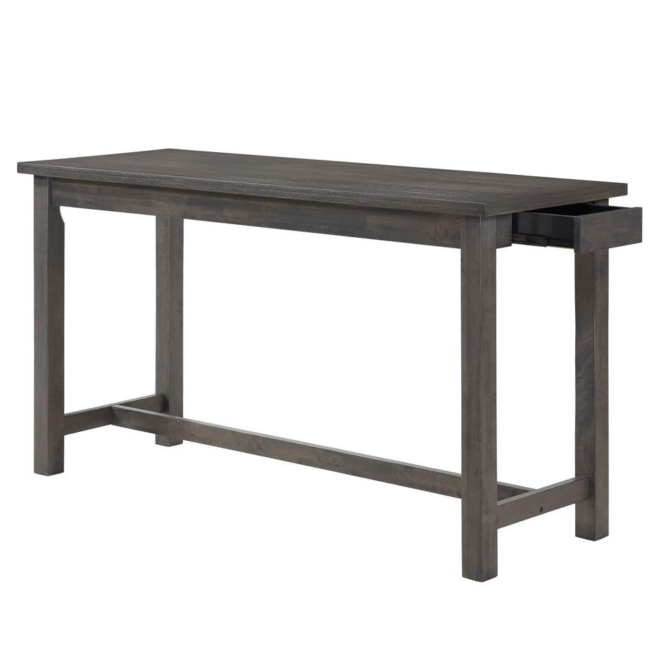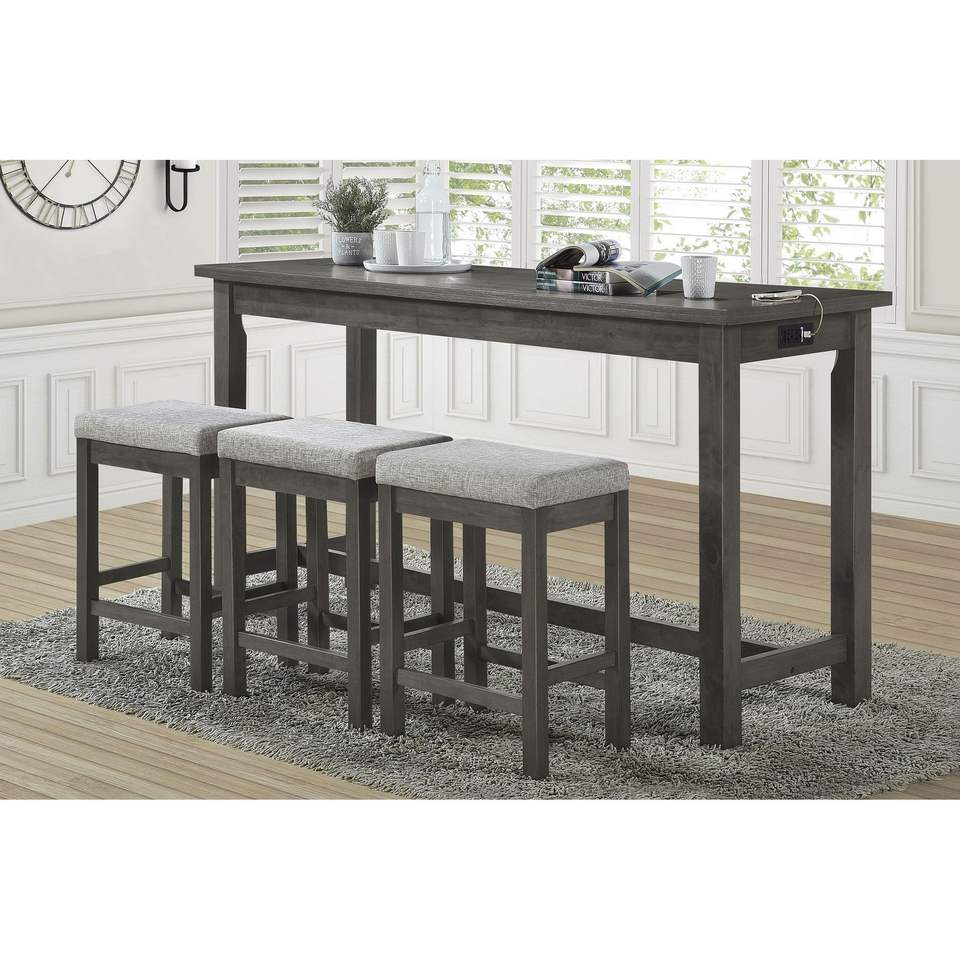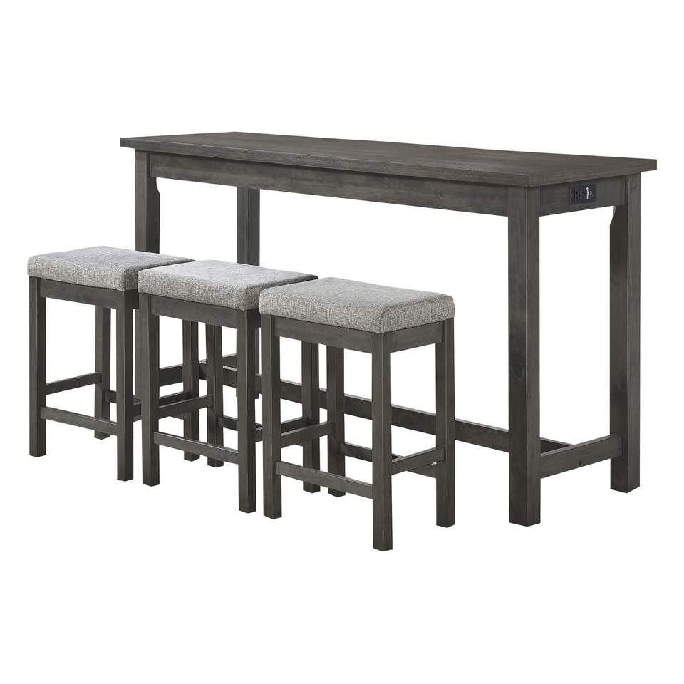 Set da Pranzo da 4 Pezzi con Finitura Grigia, Altezza Bancone, Porte USB, Prese di Corrente, 3 Sgabelli Casual, Tavolo con Cassetto Integrato, Tavolo da Sala da Pranzo 3