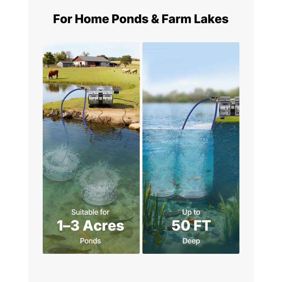 Aeratori per laghi da 5.2CFM per laghi fino a 3 acri, compressore d'aria da 3/4 HP, 2 diffusori, 100 tubi pesati, aeratori per acquacoltura