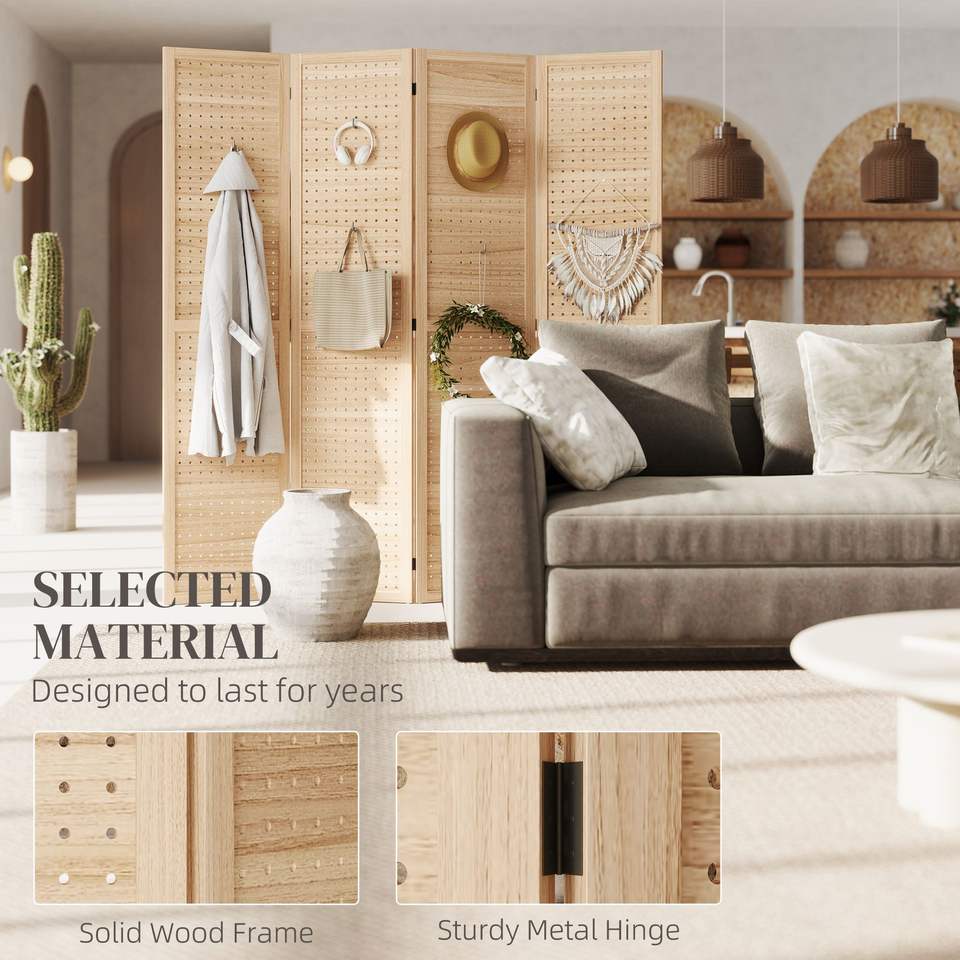 Paravento Pieghevole a 4 Pannelli Alto 5,6 Metri in Legno Naturale con Fori per Appendere