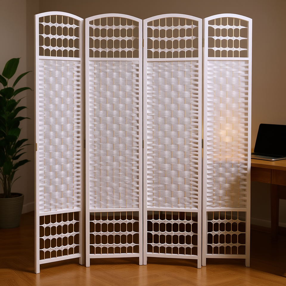 Modern White 4-Panel Folding Privacy Screen Woven Fiber Freestanding Room Divider for Home Office or Rooms