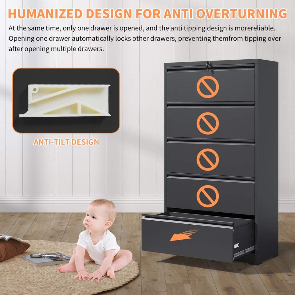 Armadietto per archiviazione laterale in metallo a 5 cassetti Black chiudibile a chiave per l'ufficio domestico legale/lettera/A4/F4 Size