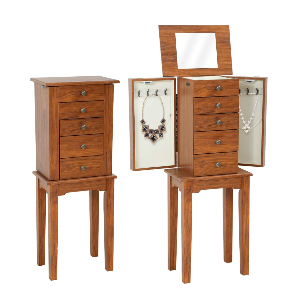 5 Drawers 8 Necklace Hooks Wooden Standing Jewelry Cabinet Wood Storage Cabinet Chest with Top Storage Organizer Flip Mirror