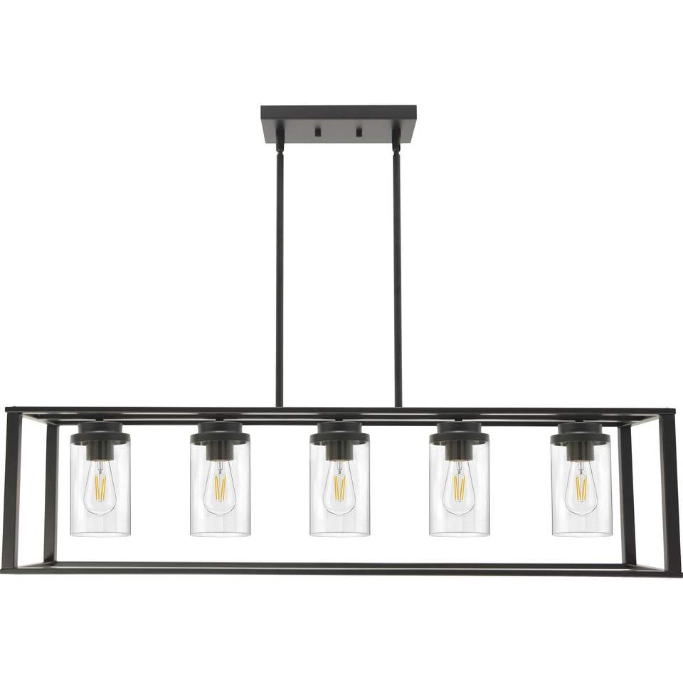Lampadario a sospensione moderno a 5 luci per isola cucina, con paralume in vetro trasparente e gabbia lineare, per illuminazione sala da pranzo