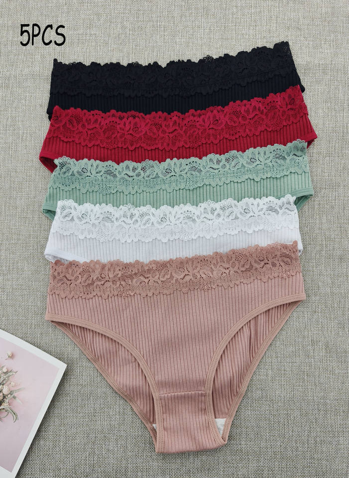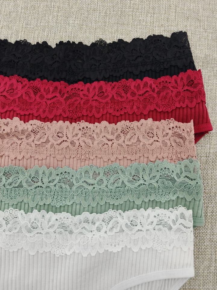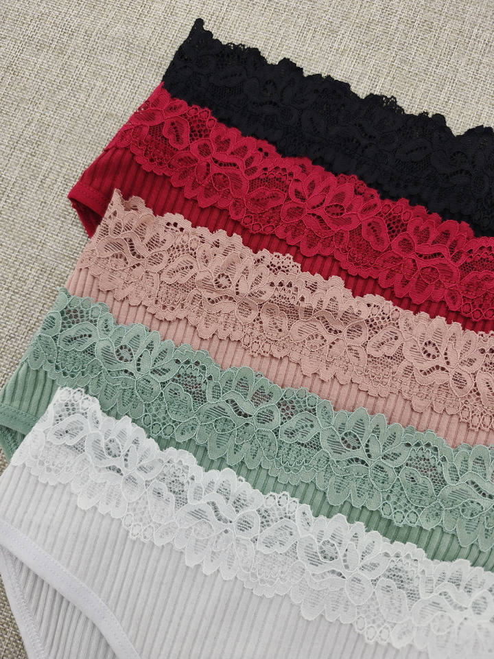 5 Pieces Pack Women's Underwear Adult Briefs Ribbed Panties with Floral Lace Sexy Half Coverage Bikini Culottes En Coton