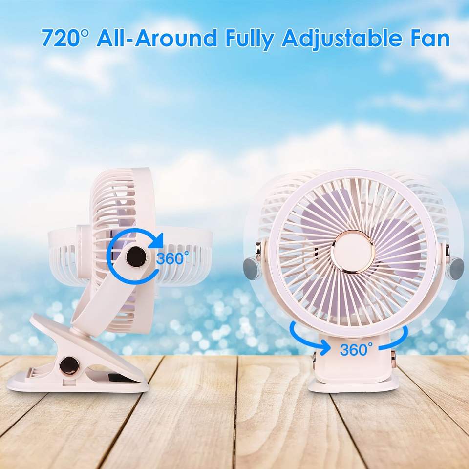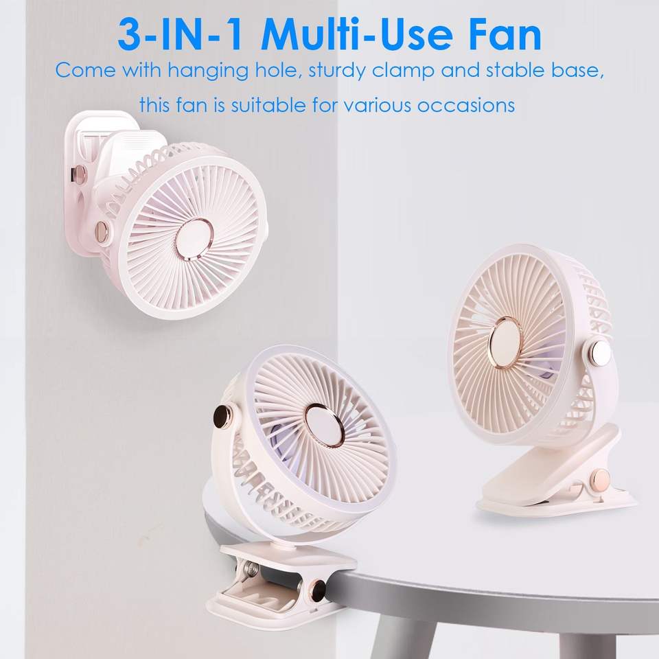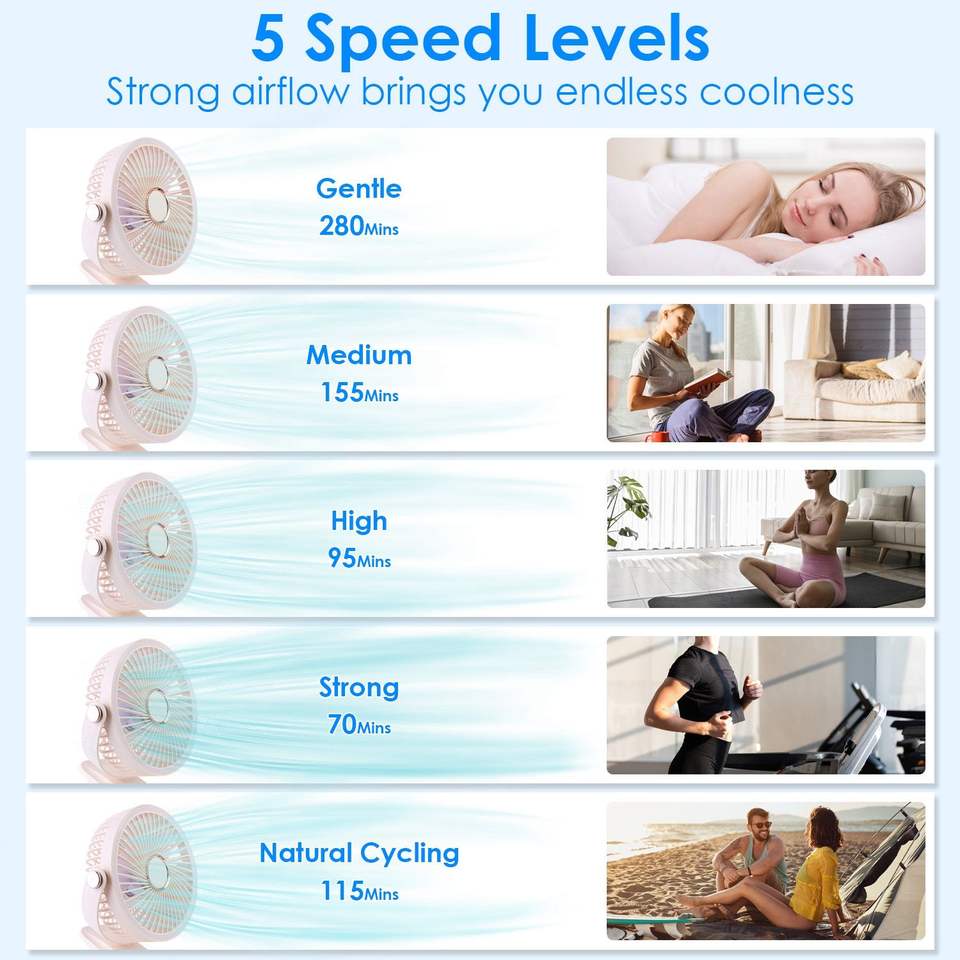 Ventilatore da tavolo e da parete ricaricabile USB-C con clip, 5 velocità, 3 livelli di luminosità, regolabile a 720 gradi