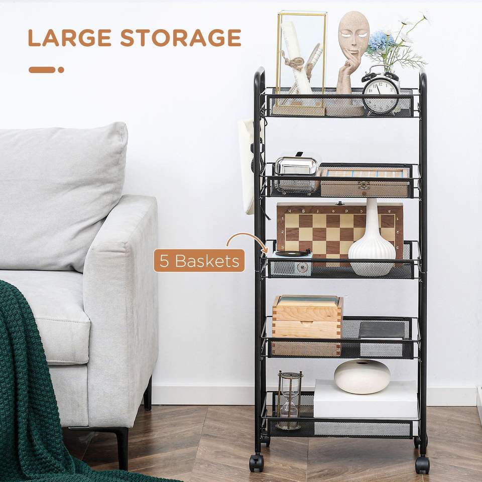 Carrello portaoggetti in metallo a 5 ripiani con ruote, per cucina, soggiorno, lavanderia e garage, con cestini a rete rimovibili