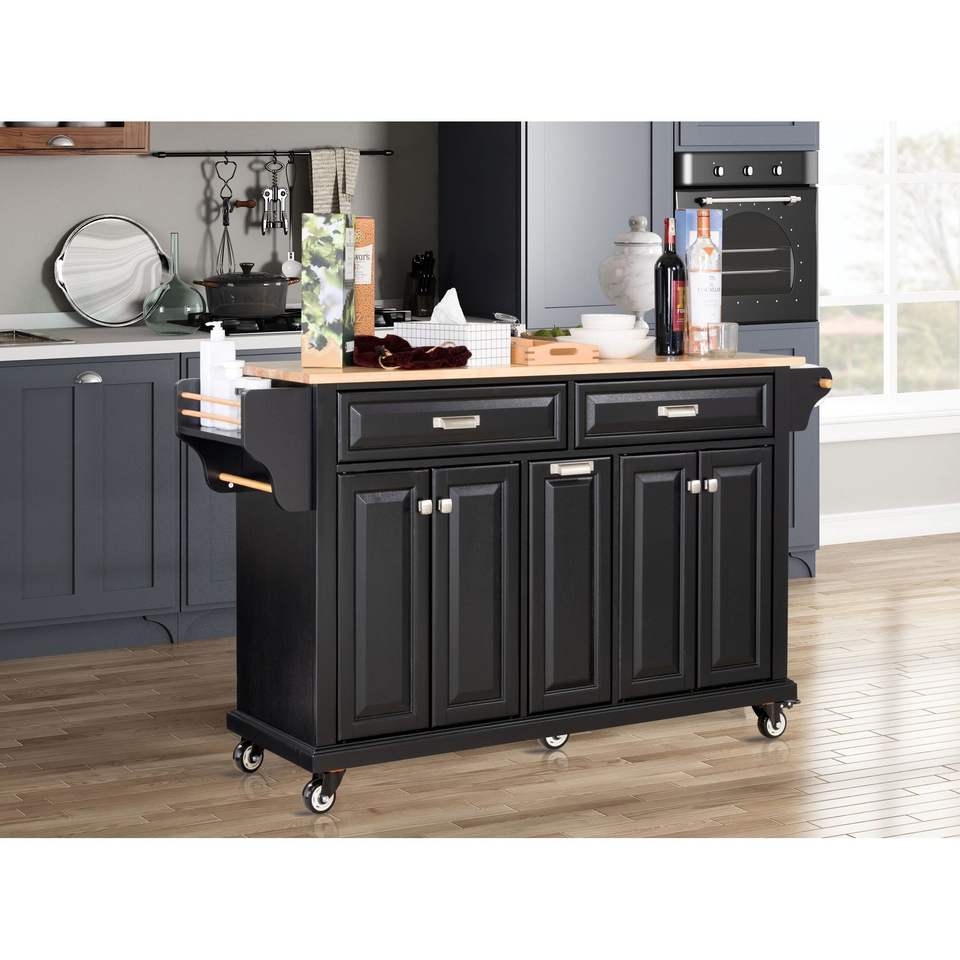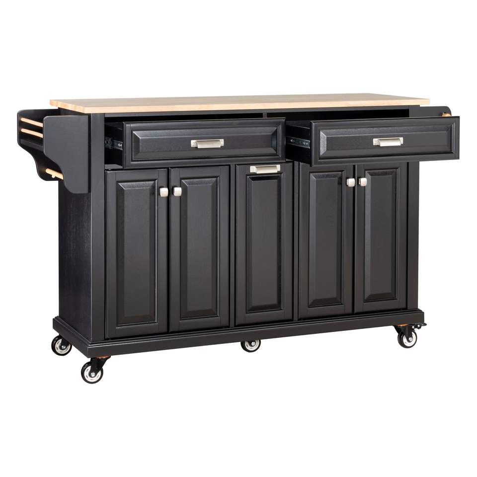 Carrello da Cucina a 5 Ruote con Armadietto, 2 Cassetti Superiori, Isola da Cucina con Piano in Legno di Gomma, Doppio Carrello Centrale per Isola Cucina