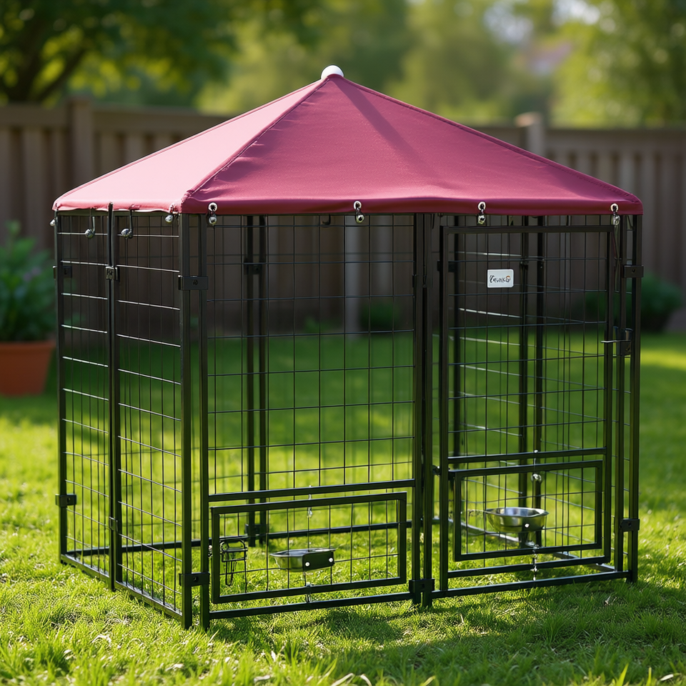 Recinto per cani da esterno in acciaio 5x5 con tettoia rossa resistente ai raggi UV, box per animali domestici con porta ciotole