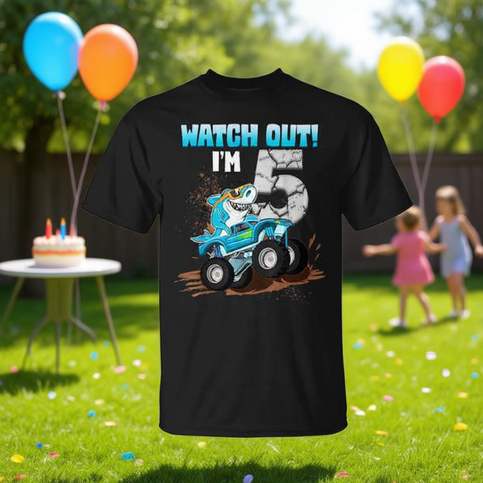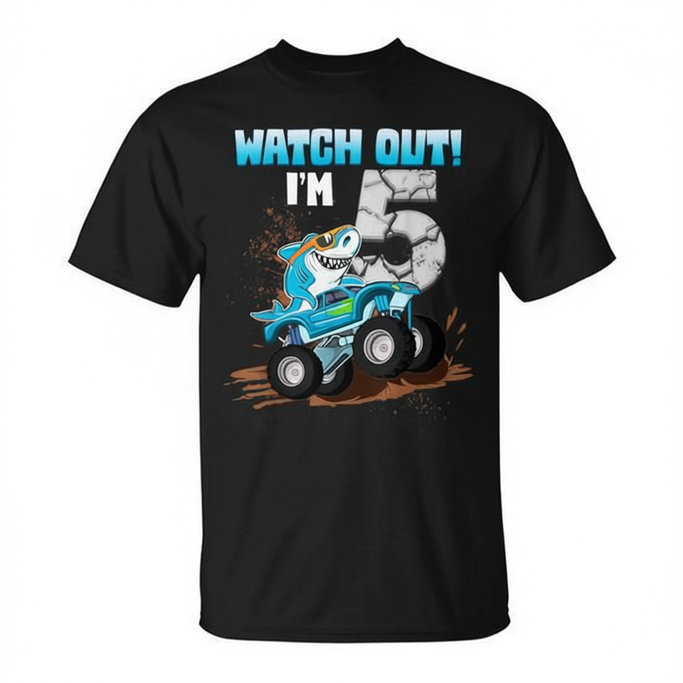 Maglietta da Gamer per Bambini di 5 Anni, con Motivo Squalo e Monster Truck, per il 5° Compleanno, Prodotto Promozionale
