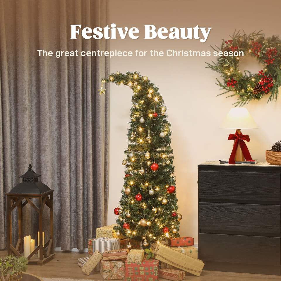Albero di Natale preilluminato da 1,5 m con cima piegata, abete alta montagna sottile e fantasioso con 100 LED e supporto in metallo verde