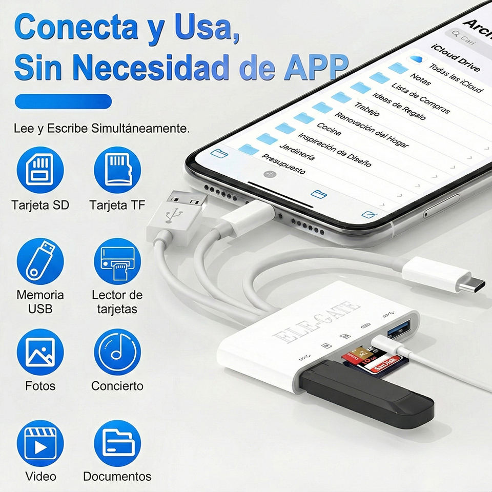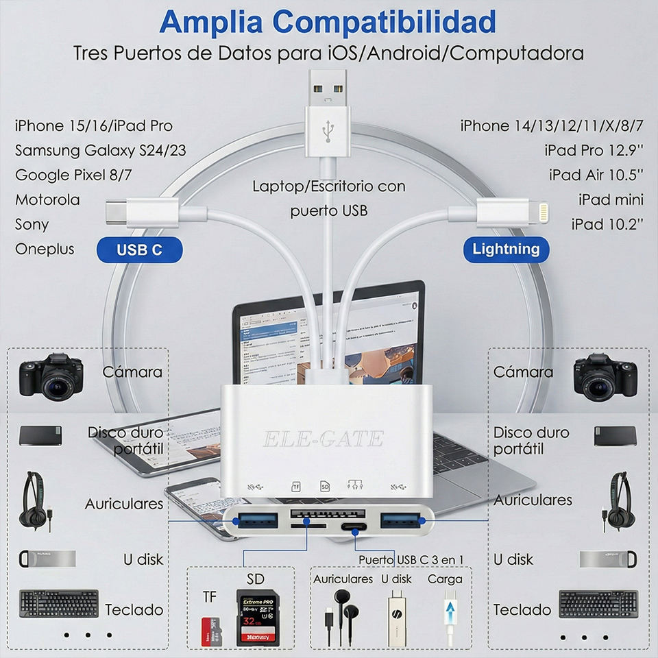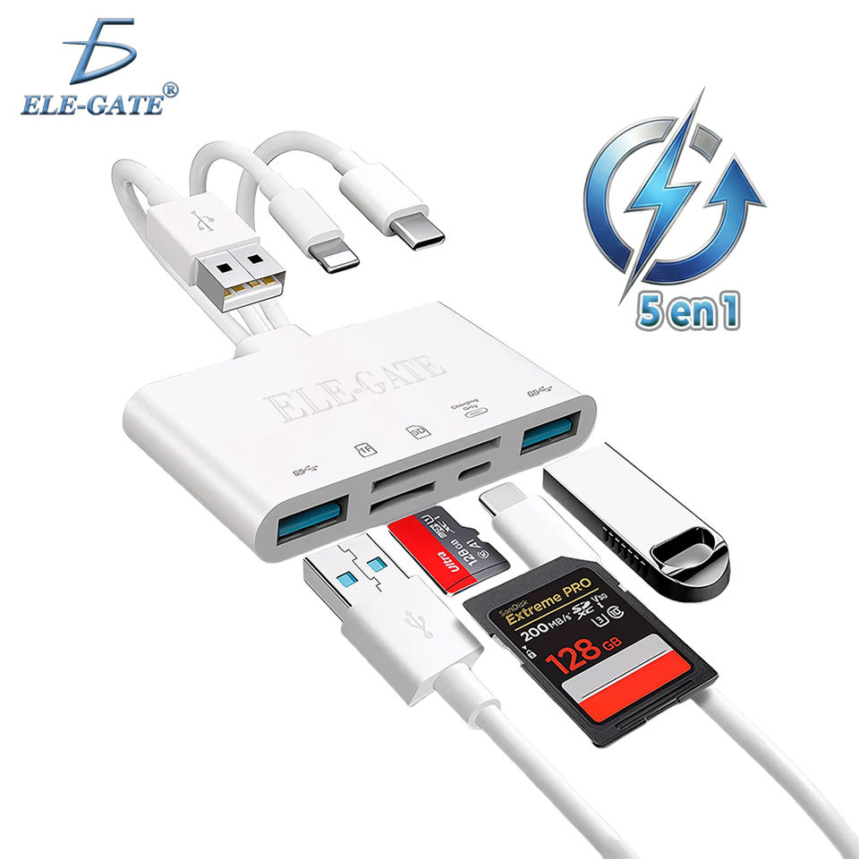 Lettore di Schede Intelligente 5-in-1 con USB USB-C per Adattatore OTG Lightning, Supporta Schede SD e TF, Porta USB 2.0, Certificato ROHS