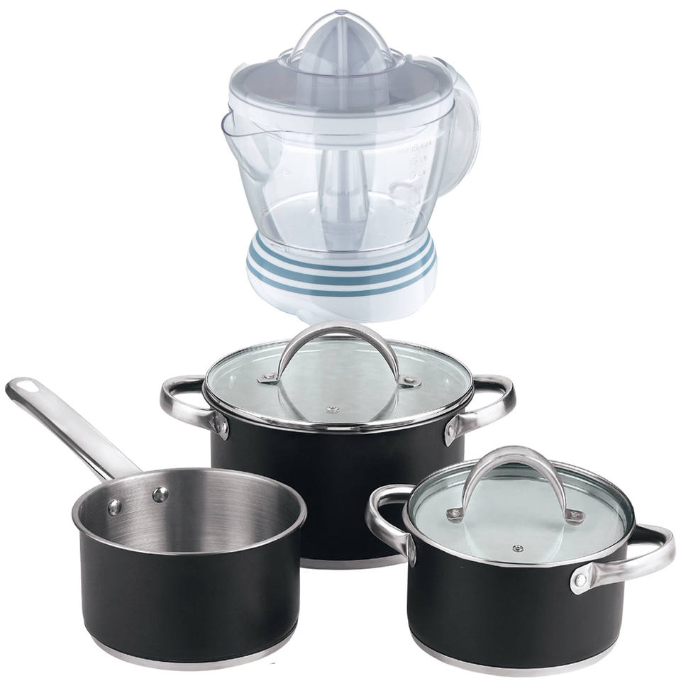 5-piece cookware set (2 saucepans with lids + saucepan) stainless steel with coating + Bergner NATURALLY - 40W Juicer - 1.2