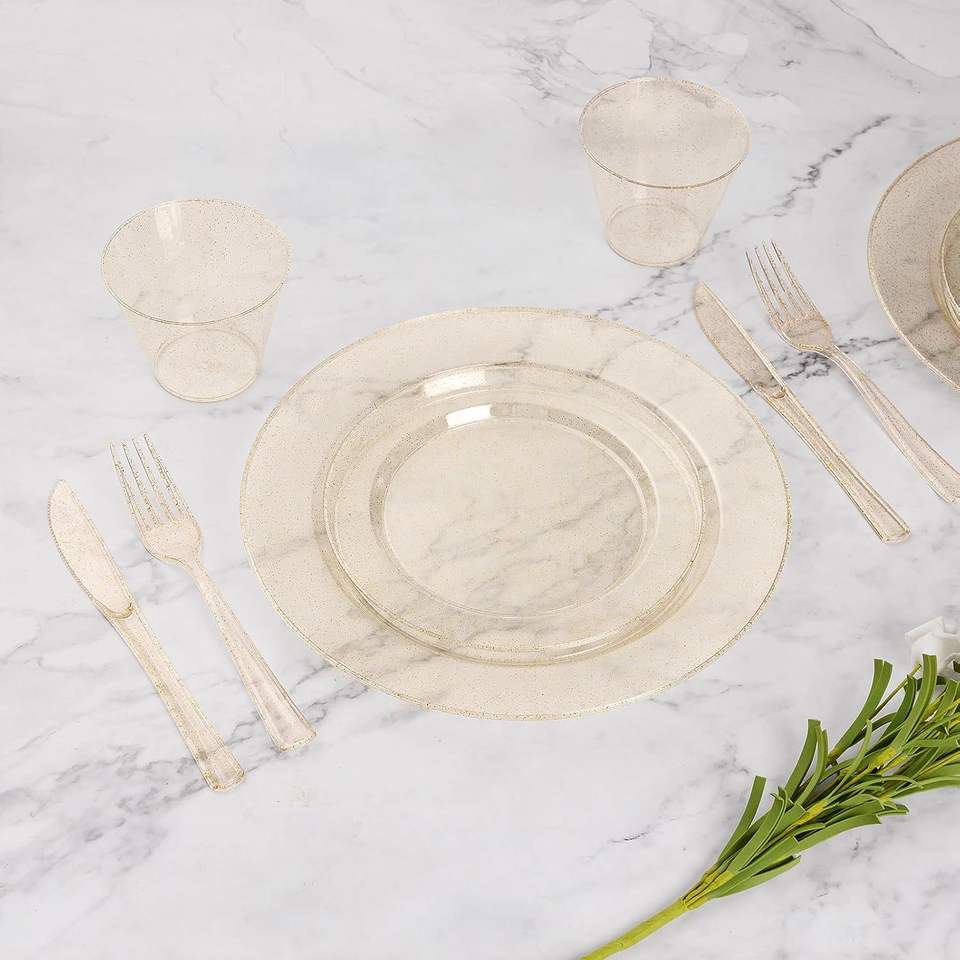 Set di Stoviglie Monouso in Plastica per 50 Ospiti, 350 Pezzi con Glitter Dorato, Include 50 Piatti per Cena e Dessert per Feste