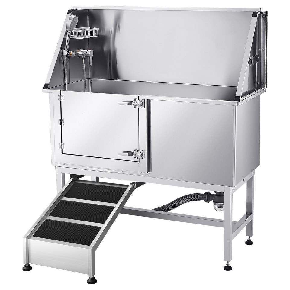 Vasca per toelettatura cani in acciaio inossidabile da 50 pollici con rampa, pannello filtro acqua in PE, rubinetto, soffione doccia e porta sapone per la pulizia e il bagno degli animali domestici