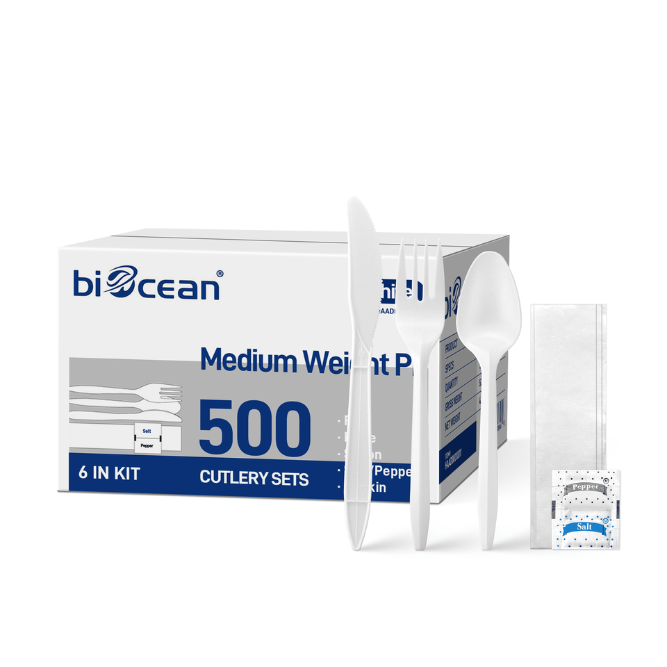 Set di posate in plastica PP di peso medio da 500 pezzi con contenitori per sale e pepe, colore bianco