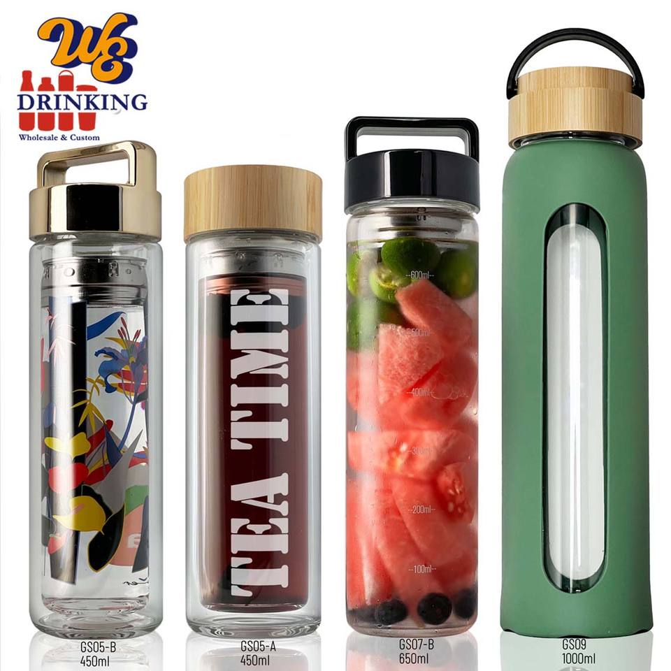 500ml 650ml 1000ml BPA Free Borosilicate Double Wall Glass Tea Fruit Infuser Glass Water Bottles with Bamboo Lids