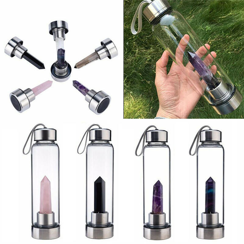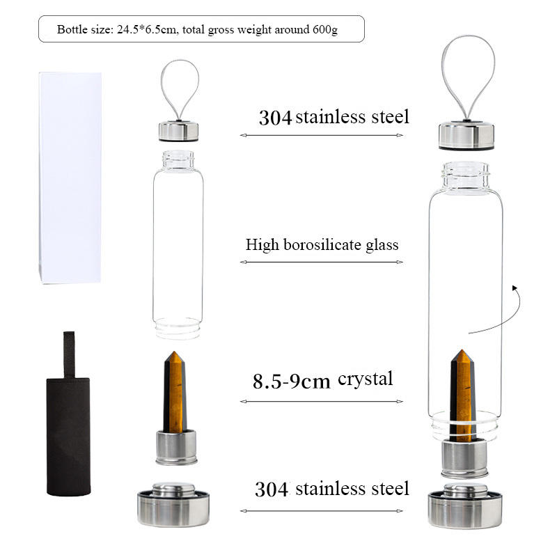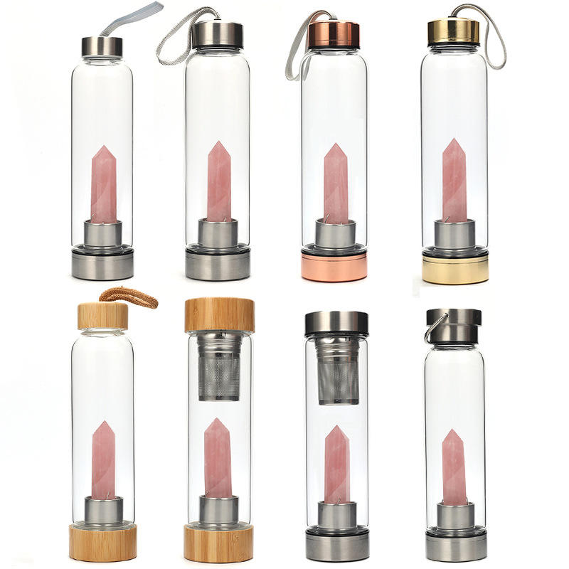 Bottiglia d'acqua in vetro da 500 ml con infusore di cristalli, bottiglia per bere con cristalli curativi, coperchio in bambù e acciaio inossidabile.