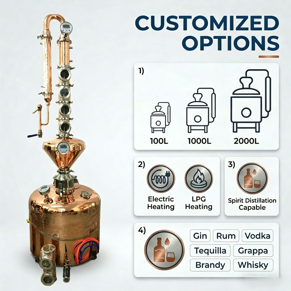 Alambicco a riflusso in rame/acciaio inossidabile da 50L, 100L, 200L per distillazione di vodka, rum, whisky e altri alcolici - Attrezzatura per distilleria