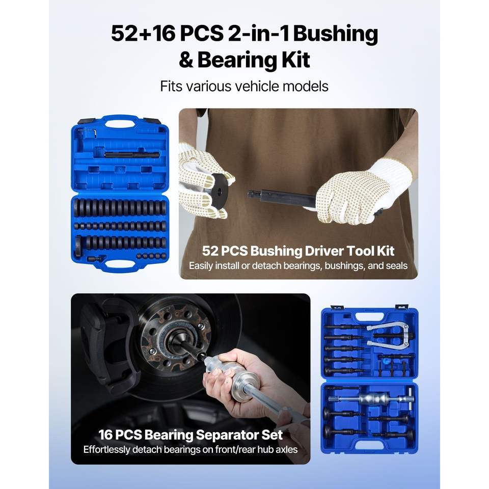 Kit pressa cuscinetti 2-in-1 da 52+16 pezzi con set di attrezzi per montaggio guarnizioni e cuscinetti, 49 boccole e 10 attrezzi a C per esigenze di assemblaggio utensili