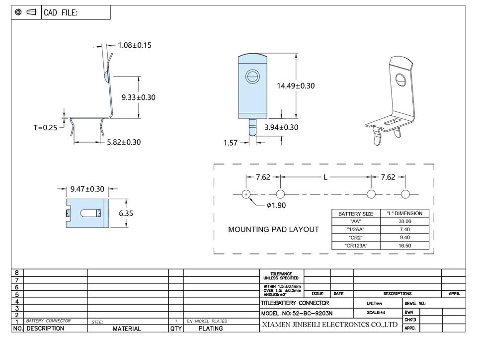 Connettore per Batteria 52-BC-9203N DIP Foro Passante 14500 AA CR2 1/2AA CR123A Clip per Batteria PC