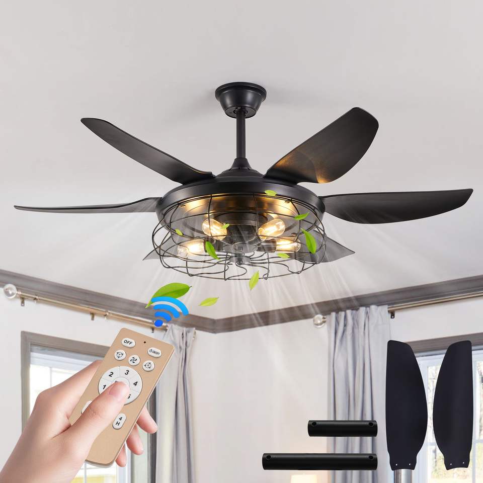 Ventilatore da soffitto moderno industriale da 52 pollici con design a gabbia e luce, 6 pale, velocità regolabile per soggiorno e camera da letto, nero