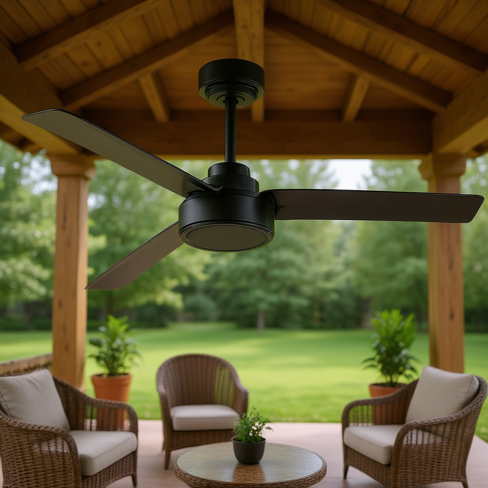 Ventilatore da soffitto nero da esterno 52 pollici con 3 pale, telecomando, motore DC reversibile, stile rustico per soggiorno