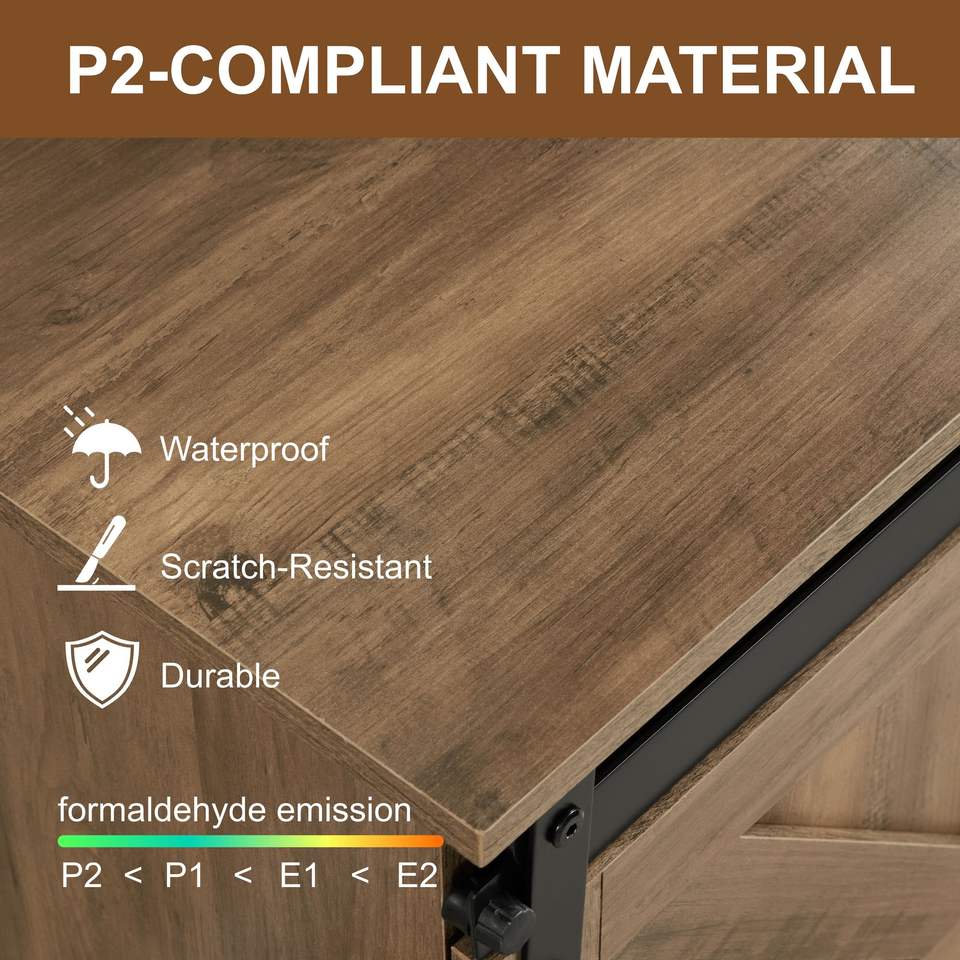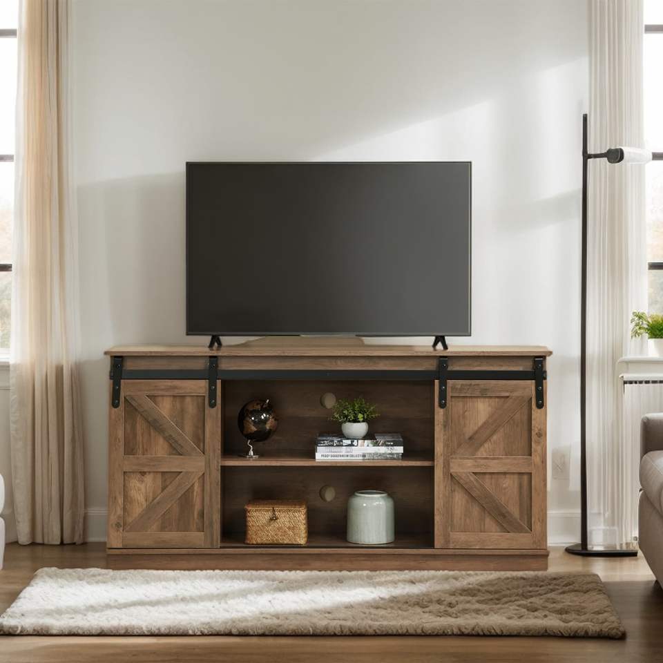 Mobile TV in Stile Rustico da 58 Pollici, Centro Intrattenimento per TV fino a 65 Pollici con Ante Scorrevoli e Armadietti, Finitura Naturale