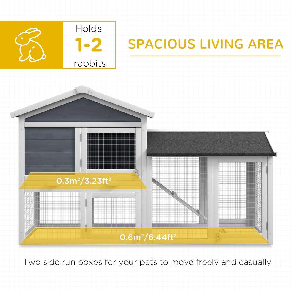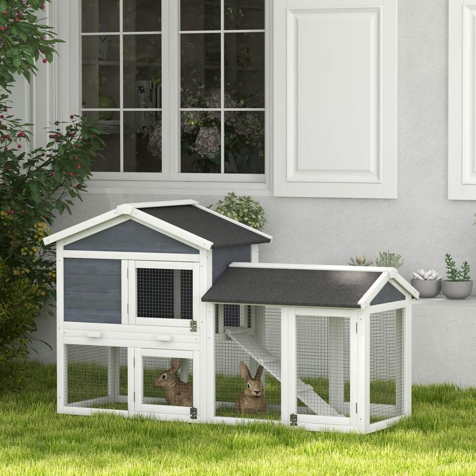 Gabbia per Conigli da 58 Pollici Grigia con Recinto, Porte Bloccabili, Vassoio Rimovibile e Tetto in Asfalto - Cuccia in Legno per Animali Domestici