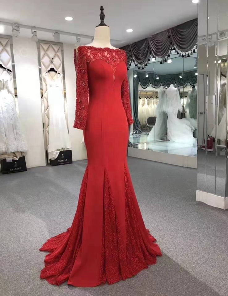 5842 # Sweep Train Red Off spalla manica lunga pizzo perline lusso elegante abito da sera abito da ballo abito da sera