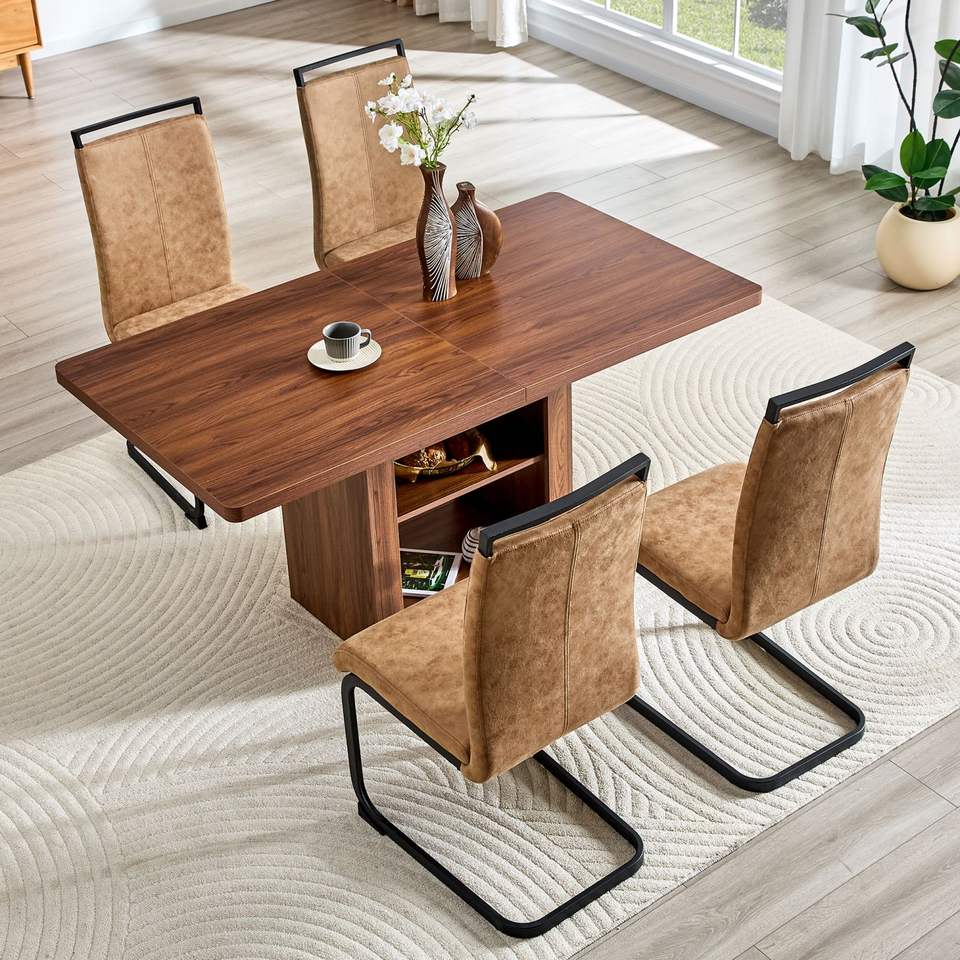 Set Tavolo da Pranzo Allungabile 59-71 Pollici con Piano in MDF Noce e 4 Sedie in Tessuto Tecnologico Marrone per Sala da Pranzo