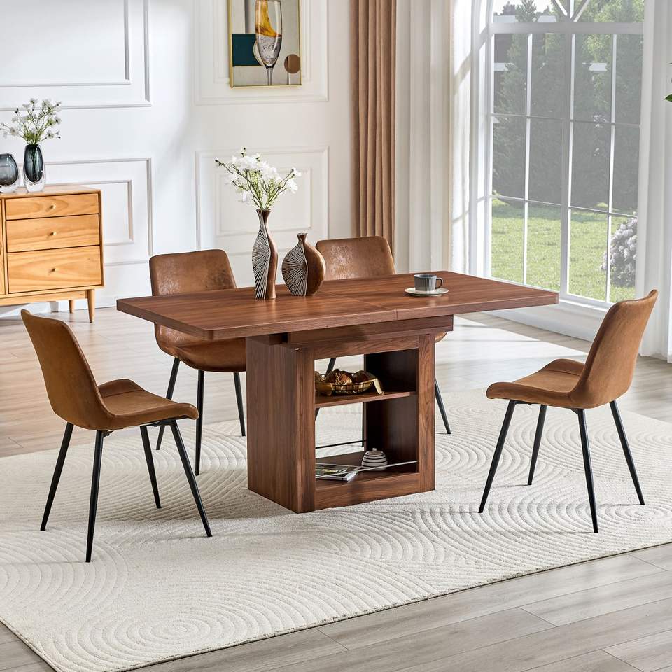 Set Tavolo da Pranzo Espandibile 59-71 Pollici con 4 Sedie, in MDF Noce e Tessuto Tecnologico Confortevole