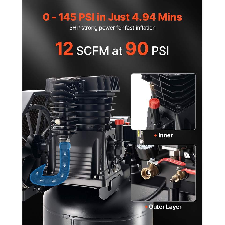Compressore d'aria industriale lubrificato a olio da 5HP, 12 SCFM, 90-145 PSI, per impieghi gravosi, con serbatoio da 60 galloni, modello D0100X3KZEJ