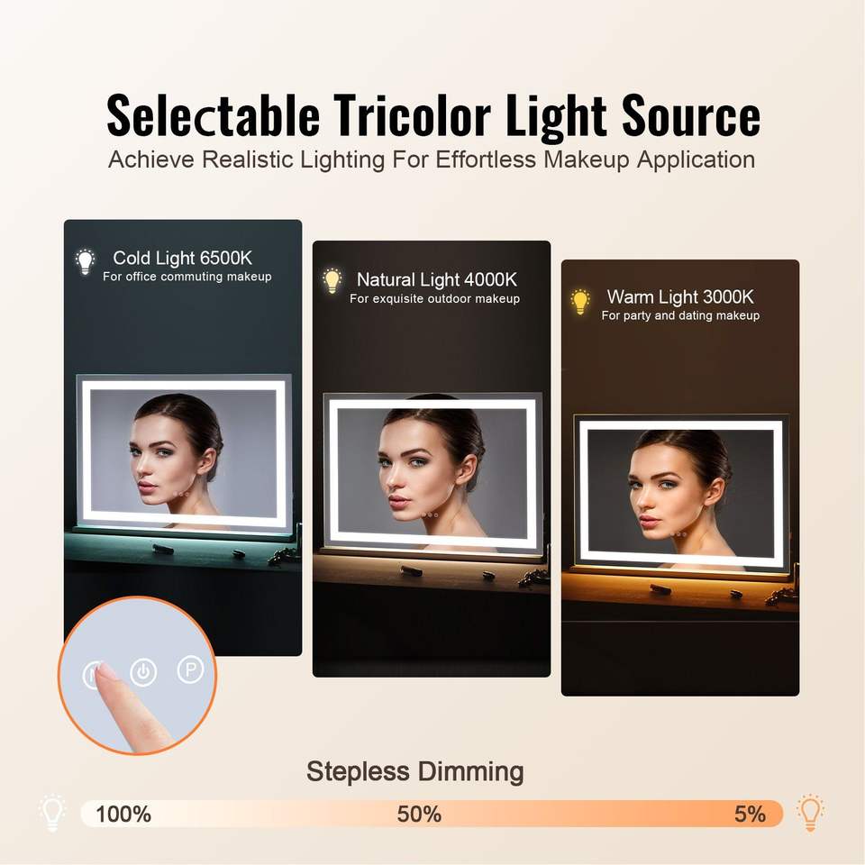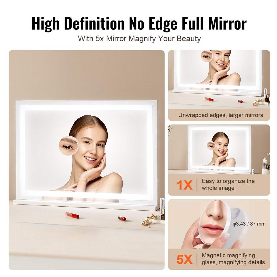 Specchio per Trucco LED con Ingrandimento 5X, Alimentazione USB, Tre Modalità di Illuminazione, Controllo Touch Intelligente, Grande Formato