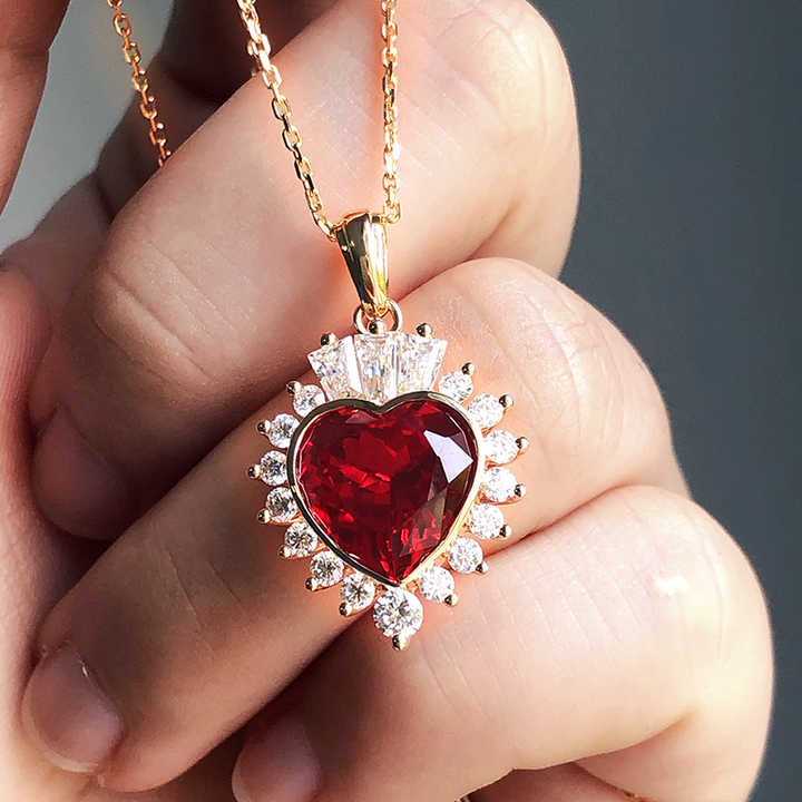 Collana con Rubino Sintetico da 5 Carati e Catena da 18 Pollici, Taglio a Cuore, Diamante in Oro Giallo 14k per Matrimonio