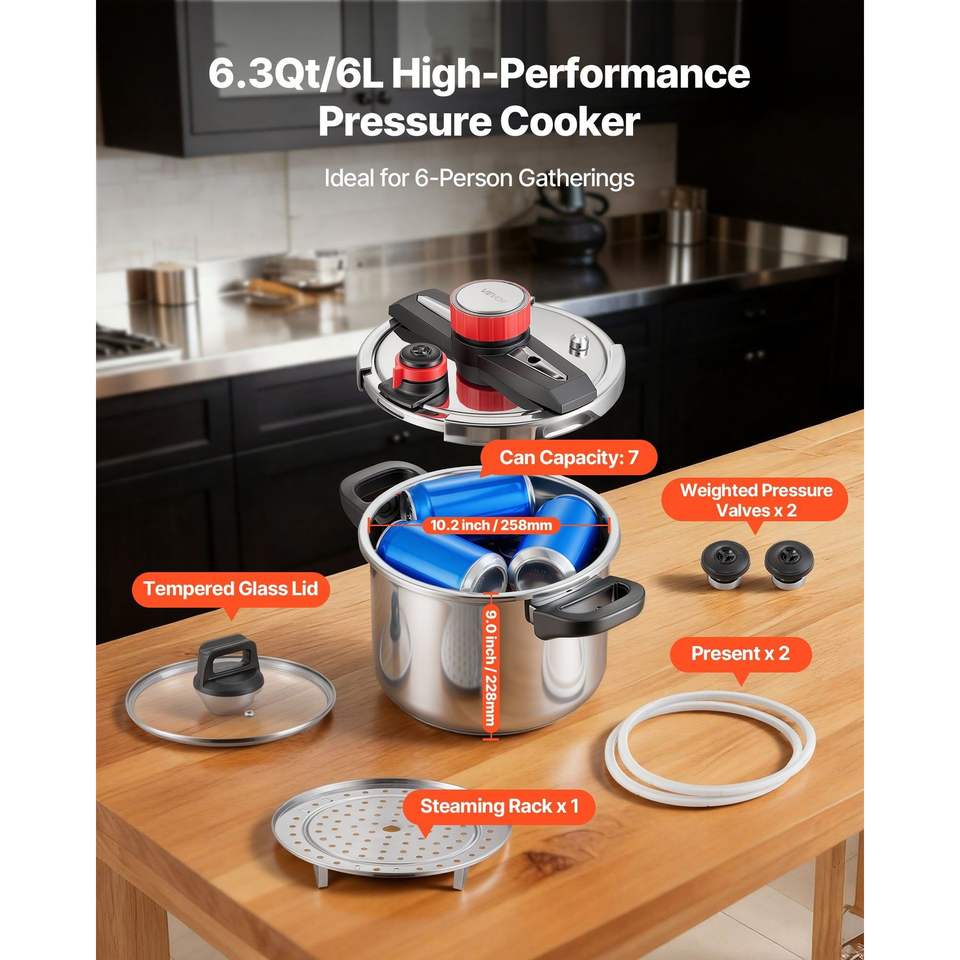 Pentola a Pressione in Acciaio Inox da 6,3 Litri con Coperchio in Vetro Temperato e Griglia per Cottura a Vapore, Pentola a Tripla Pressione