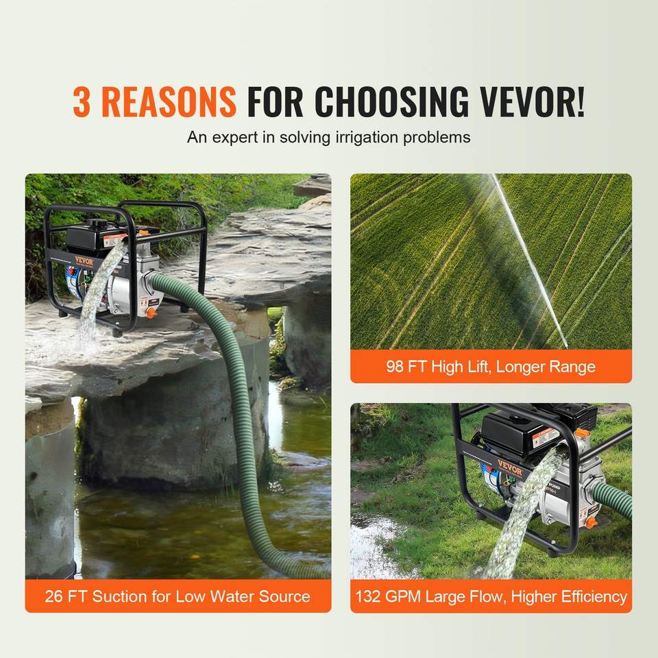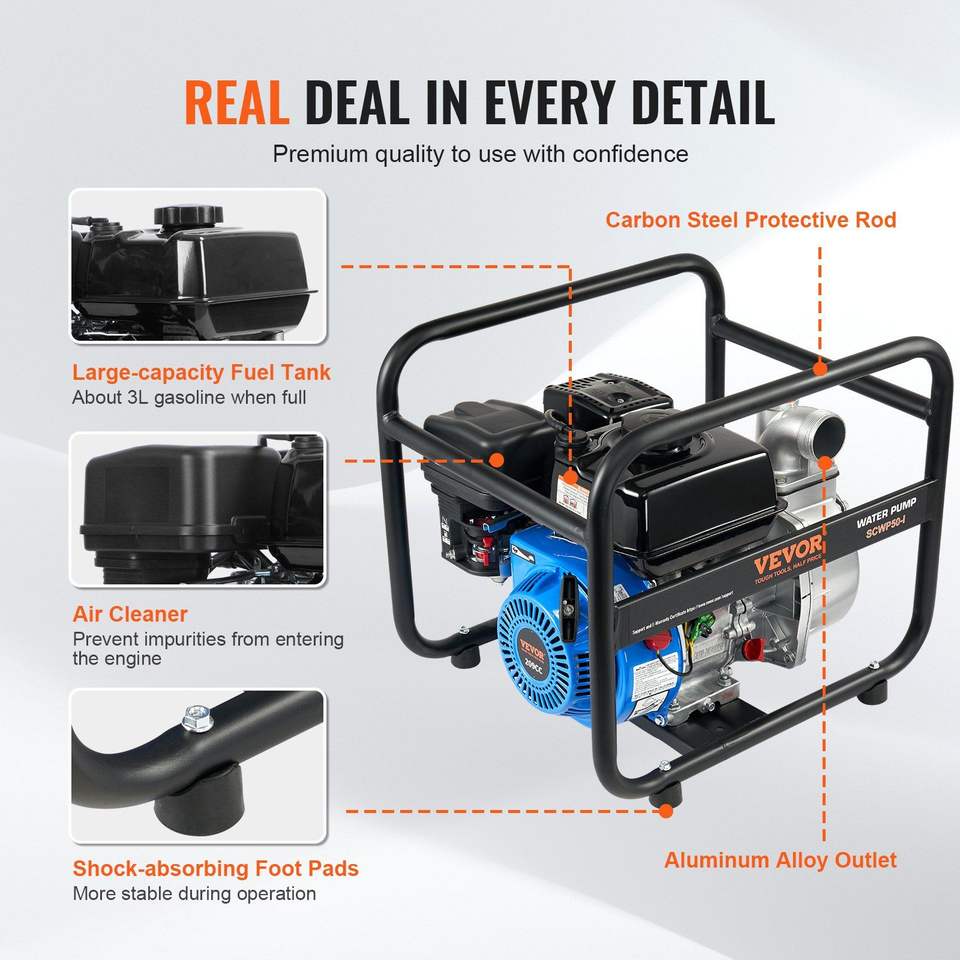 Pompa per rifiuti a benzina da 6,5 HP, 132 GPM, motore a 4 tempi, sollevamento massimo 98 piedi, pompa per trasferimento acqua con portata massima 26 piedi, per piscina, 2 pollici/50 mm