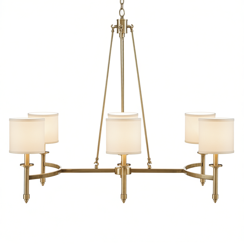 Lampadario a 6 Luci con Finitura Dorata e Paralumi in Tessuto, Lampada a Sospensione per Soggiorno