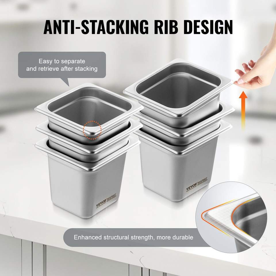 Set di 6 Vaschette Gastronorm 1/6 Anti-Aggrovigliamento per Bagni di Mare, in Acciaio Inox Spessore 0,8mm, Profondità 6 Pollici, per Hotel e Ristoranti
