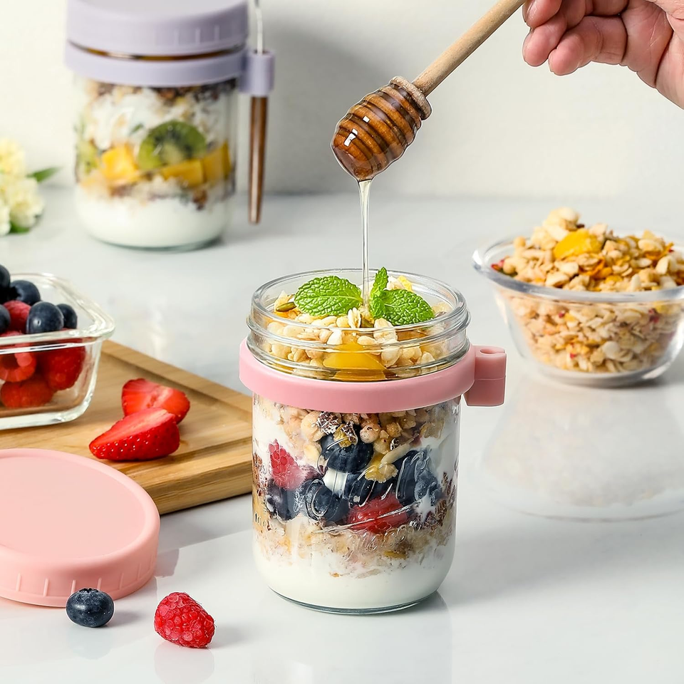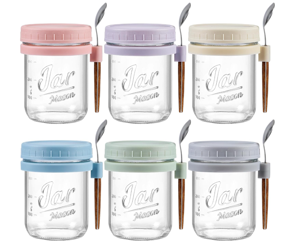 Set di 6 Barattoli in Vetro da 16 oz per Overnight Oats con Coperchi e Cucchiai, Grande Capacità, Ermetici e Trasparenti per Latte, Cereali, Frutta