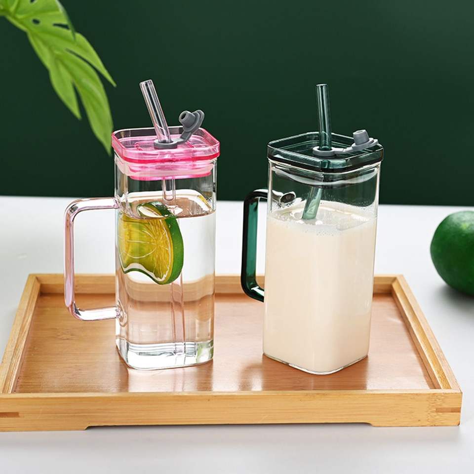 Set di 6 Bicchieri in Vetro Borosilicato di Alta Qualità, Quadrati, 6 Colori, con Coperchio per Latte, Succhi e Bevande Fredde