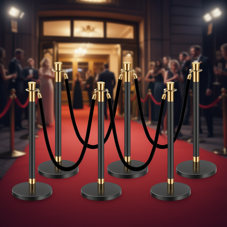 Pali delimitatori in acciaio inossidabile con corde in velluto, base cava nera, barriere per il controllo della folla, per teatri e feste, modello