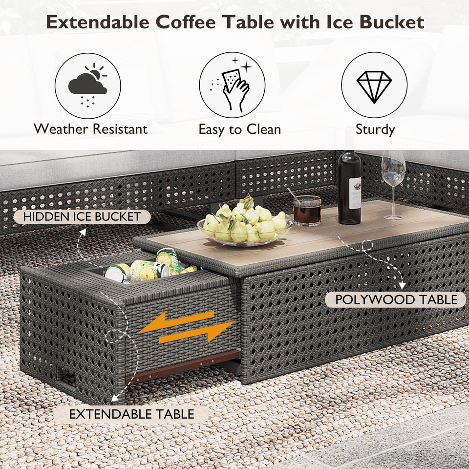 Set di mobili componibili da 6 posti con tavolini da caffè allungabili per 6 persone, cuscini profondi per la conversazione