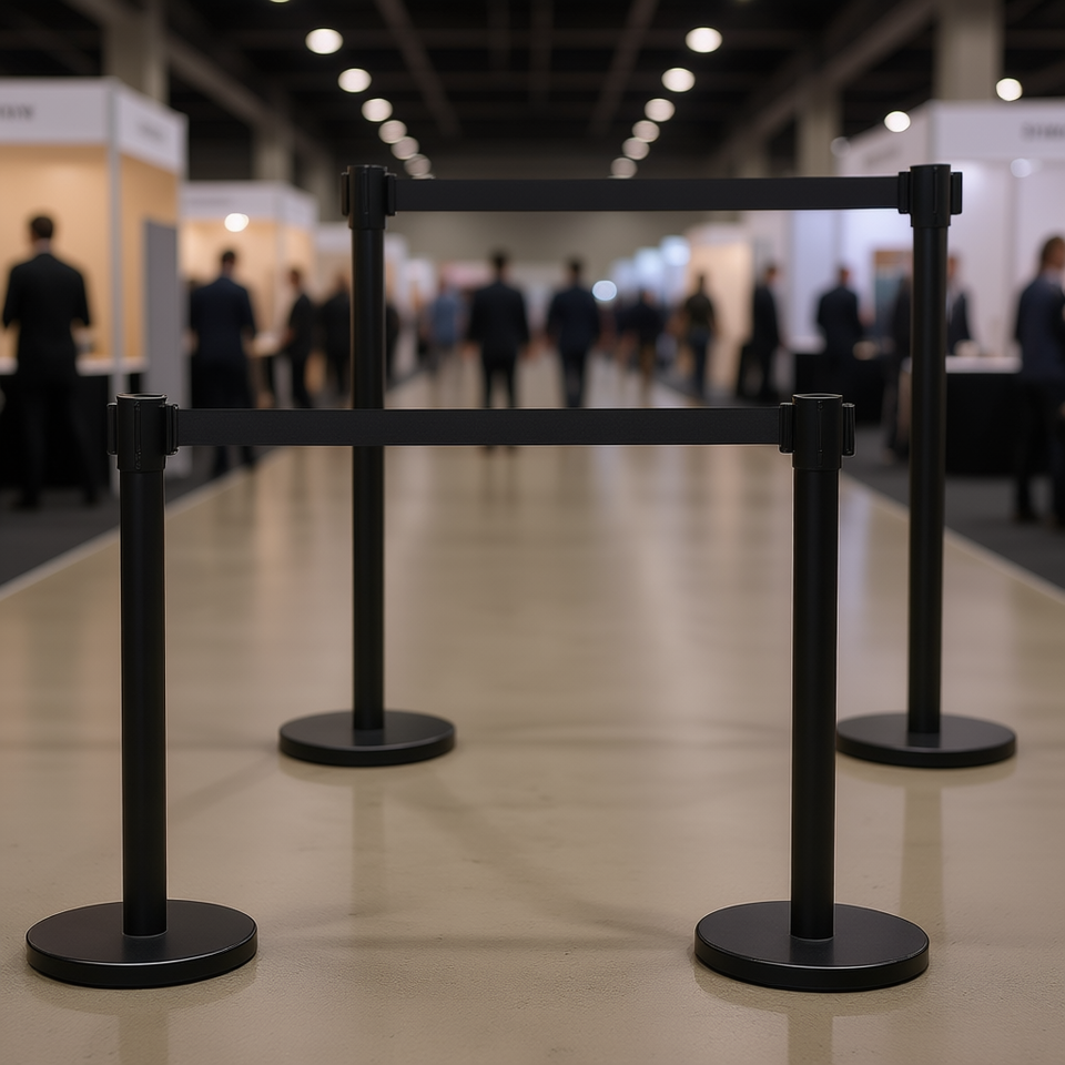 Set di 6 Pali Retrattili Neri per Code con Cinghia da 2 Metri per Gestione Code Fiere, Struttura in Acciaio